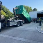 „Schnell war klar, den Container von der Pressanlage trennen, um die Kartonagen im Inneren des Behälters zu löschen. Dazu wurde das Wechselladefahrzeug (Last) unserer Feuerwehr angefordert.“ erklärt Feuerwehreinsatzleiter Sascha Jung (FF Bad Vöslau Stadt).