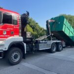 Nach dem Eintreffen am Einsatzort in Bad Vöslau wurde der Abrollcontainer mit dem Hakenlift unseres Last von der Müllpresseinheit getrennt. Mit einem Rohr konnte nun das noch leicht rauchende Altpapier abgelöscht werden.